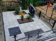 Изначальное состояние места захоронения – отсыпанный песком участок. Клиентку не устраивало подобное наземное покрытие: сложное в уборке и не очень привлекательное внешне. Заказчица пожелала заложить могилу бетонной плиткой, сохранив два цветника.